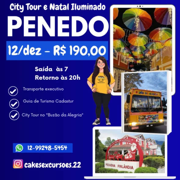 Faremos um City Tour no "Buzão da Alegria" com Guia Local em Penedo. Visitaremos fábrica de chocolate, cachoeira, A Casa do Papai Noel e muito mais.