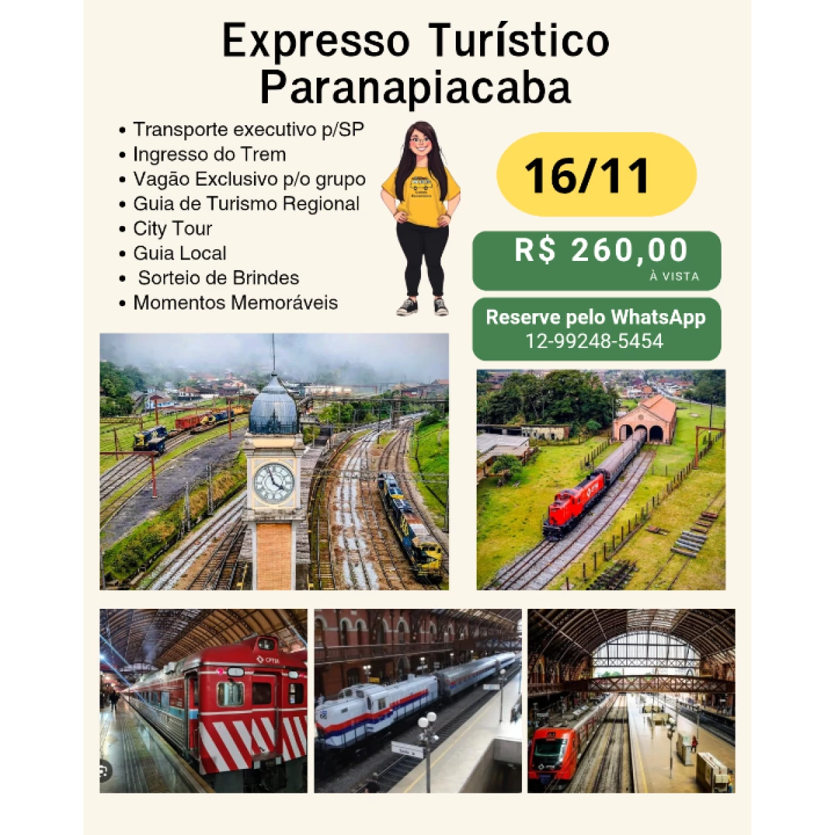 Saída de Taubaté às 5h, de ônibus executivo até a Estação da Luz em São Paulo. Em seguida, embarque o Expresso Turístico CPTM até a Vila Paranapiacaba. Retorno da Vila Paranapiacaba às 16h de trem a São Paulo e em seguida de ônibus a Taubaté.